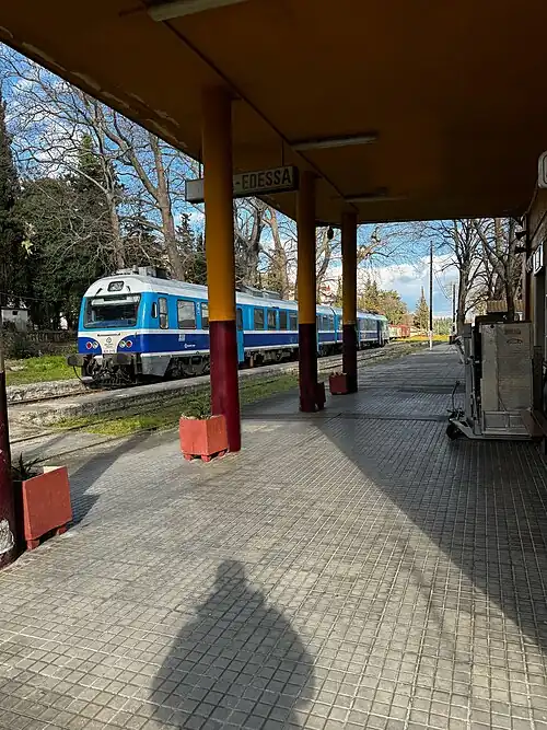 The Edessa railway station (Greek: Σιδηροδρομικός σταθμός Εδέσσης, romanized: Sidirodromikós stathmós Edéssis) is the railway station of Edessa in Central Macedonia, Greece. The station is located north of the city on the Thessaloniki–Bitola railway, and is severed by the Thessaloniki Regional Railway (formerly the Suburban Railway).[4] The station lies some 77 kilometres (48 mi) from Thessaloniki.[5]
