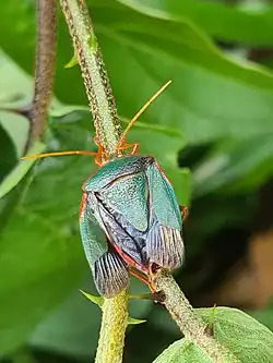 - ^ a b c Daniel P. Silva; Paulo S. Oliveira (1 December 2010). "Field Biology of Edessa rufomarginata (Hemiptera: Pentatomidae): Phenology, Behavior, and Patterns of Host Plant Use" (PDF). Environmental Entomology. 39 (6): 1903–1910. doi:10.1603/EN10129. ISSN 0046-225X. PMID 22182556. Wikidata Q39462889.