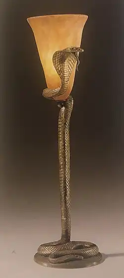 As a result of Brandt's Escalier Mollien commission, Brandt's influence among the publicity and the decorative-arts community increased. In turn, he began to expand his presence and started to collaborate with architects, the Daum Frères glassworks, and the suppliers of marble and alabaster. Brandt did a number of works with Daum, specifically when designing lamps and chandeliers. Two lamps in particular Brandt designed with Daum are the La Tentation and the Cobra lamps. Both lamps depict snakes rising from their bases and cradling an alabaster Daum glass shade. Favier began working with Brandt in 1919 when Brandt sought him out to create a new set of buildings to house the Brandt company. From that time on, Favier headed Brandt's design staff up until he resigned in 1927. Favier worked on a number of works with Brandt including Brandt's work in the 1925 Exposition.[14]