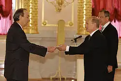 - ^ "President Vladimir Putin received the letters of credentials of new foreign ambassadors to Russia". The Kremlin, Moscow: Presidential Press and Information Office. 27 July 2007. Archived from the original on January 13, 2013. Retrieved 2008-10-07.