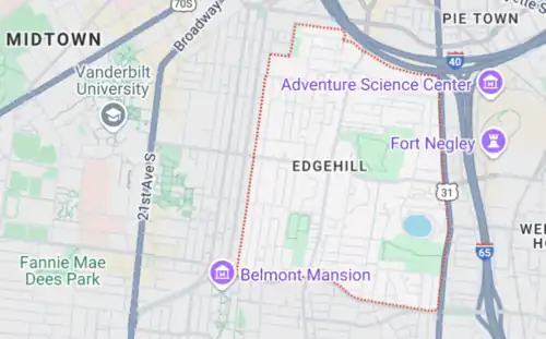 Edgehill is a historic neighborhood located just south of Downtown Nashville, Tennessee. Its geographical boundaries can be defined as: Interstate 40 at the northern, 8th Avenue South/Interstate 65 at the east, Wedgewood Avenue at the south, and 16th Avenue South at the west. These borders place Edgehill adjacent to areas such as Music Row and the Gulch. Additionally, the area is in close proximity with two different universities: the freshman part of the Vanderbilt University campus, and Belmont University, which is almost immediately outside the western border of the neighborhood.
