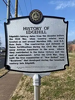 Founded by freed African Americans after the American Civil War, Edgehill, which started off as geographically situated between Fort Casino and Fort Morton, became one of Nashville’s earliest Black neighborhoods. The Union designated this area a contraband camp for fugitive slaves. Once the war ended, these fugitive slaves remained in the neighborhood.[3]