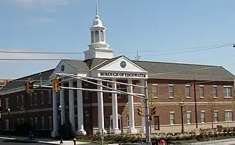 Borough Hall, the Binghamton Ferry and the Edgewater Public Library are listed on both the National Register of Historic Places and the New Jersey Register of Historic Places.[77] Constructed in 1904, Borough Hall was granted $406,000 by Senate and General Assembly of New Jersey in August 2009 for restoration of the building.[78] Among other renovations, the missing gargoyles were returned to the 1902 edifice.[79][80]