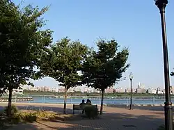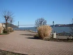 The promenade along the Hudson is part of the Hudson River Waterfront Walkway. In 1988, construction of a waterfront walkway was mandated by state law that would allow walkers a path along the Hudson River from Bayonne up to the George Washington Bridge.[85] Although property owners were required to build and maintain it, many gaps remain.[86] Of the 18.5 miles (29.8 km) called for, only 11 miles (18 km) are complete, and many of the gaps occur in Edgewater.[87] The completed stretches offer paths for walking along the Hudson River with views of Manhattan.