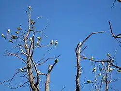 Edgewater is the home of a free-flying colony of monk parakeets, also known as Quaker parrots, which are native to South America. These small, green parrots have lived in Edgewater since at least 1980 and were numbered at 200 to 230 in a 2008 article in The New York Times[88] and about 200 in 2019.[89] They are easily seen in Memorial Park and its vicinity at River Road and Route 5. The parrots build large nests of twigs and down which become permanent residences.[90] Nests four-feet long can be seen near the intersection. How the birds came to Edgewater is unknown, though a widely accepted story traces their origin to an escape from a damaged crate at John F. Kennedy Airport in the 1960s,[88] or alternatively they had been pets that escaped from their owners.[89]
