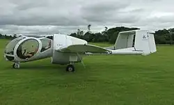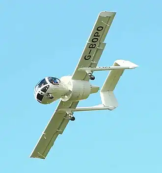The aircraft has an unusual configuration with a fully glazed forward cabin, reminiscent of a Hiller Model 360 or Hughes Model 269 helicopter, that provides 270° panoramic vision and almost vertical downward vision for the pilot and two passengers. The aircraft has twin booms with twin rudders and a high-mounted tailplane. It is powered by a Lycoming flat-six normally-aspirated engine situated behind the cabin and driving a fixed pitch ducted fan. Due to the ducted fan, the aircraft is exceptionally quiet. The aircraft has a fixed tricycle undercarriage with the nosewheel offset to the left. The wings are unswept and untapered. The aircraft is of fairly standard all-metal construction, with a stressed skin of aluminium.
