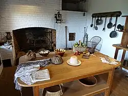 Jefferson had the kitchen upgraded to be "one of the most modern kitchens in the country". Situated below Jefferson's private terrace, it had a bread-baking oven, a stew stove with eight individually regulated burners, a large hearth, and a "set kettle", which generated hot water on demand.[12] The women had use of 60 pieces of French copper cookware, including tart pans, fish cookers, skillets, and chafing dishes. They also had a costly, accurate tall-case clock to ensure precise timing as they cooked.[12] Coffee beans were roasted, hot chocolate was made from blocks of hard chocolate, dinners consisted of three or four meats and fish, and every meal had four desserts.[12] To plan their menus, the women met with the enslaved head gardener, Wormley Hughes, to determine what was fresh or soon to ripen from the berry patches, vegetable gardens, and the orchards.[12] Edith and Fanny worked together in Washington, D.C., and at Monticello until Jefferson's death.[1]