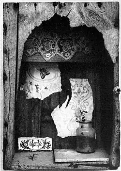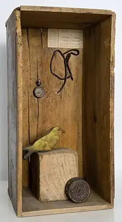 In the early 1950s Schloss also began to participate in exhibitions at an artists' co-op called the Tanager Gallery.[7] She continued her relationship with the Tanager until 1961. In that year a trio exhibition at Tanager with Lawrence Campbell and Gabriel Laderman drew an extensive review in ARTnews. Praising Schloss's "refreshing audacity", the ARTnews critic said the paintings had a "fidelity to form" and "an hypnotic visual allure", adding that they were "beautiful in a unique way".[31] At this time she also began exhibiting with the American Abstract Artists group and continued to do so for the next few years.[21] She made her first appearances in commercial galleries in 1956 when she participated in group shows at the Poindexter and the Kraushaar galleries.[7] In 1959 she was given a solo exhibition at Constance Kane's Workshop Gallery where she showed small wooden boxes along with her paintings.[32] This was probably her first solo in a commercial gallery. In reviewing it, a critic for Art Digest called her still lifes "tastefully decorative, sincere and pleasantly reminiscent of Chardin".[33] The following year she mounted a solo exhibition at the Tanager Gallery and, with her friend Helen DeMott, organized a group exhibition called "American Still Life Painting Today" for a commercial gallery, the Peridot. Art Digest's critic said the two women had made excellent choices and Dore Ashton, in the New York Times, called Schloss's paintings "noteworthy".[34][35] In 1961 Schloss participated in a major exhibition that was later understood to place assemblage as a significant artistic medium. The show contained 250 works by 150 artists dating from 1913. It attracted a good deal of critical attention including a review in the issue of Life magazine for October 20 of that year.[36][37] A review by John Canaday of the New York Times used the terms "dazzler" and "spectacular" to describe it.[38] One of the two box constructions that Schloss exhibited was pictured in the show's exhibition catalog.[39]