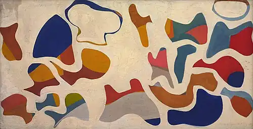 Throughout her career Schloss made small landscapes and still lifes in oil and watercolor.[5][52] Beginning in the 1950s she also made small constructions: wooden boxes with found-object contents.[52] Critics saw the influence of many artists in her work, ranging from Matisse[3] to Klee[44] and from Porter[53] to Twombly,[54] mentioning also Jean Siméon Chardin[33] and Giorgio Morandi.[55] Other supposed influences included the work of Tworkov and of Burckhardt.[43][45] She herself named Matisse, Morandi, and Piero della Francesca as her main sources of inspiration.[13] Writing in 2015 the artist and critic Thomas Micchelli noted how little effect the works of these artists appeared to have on Schloss's paintings. He said that their works had "little bearing" on her mature work but that she shared with her contemporaries an intention "to make painting new, strange and urgent, to cross the rigor of classicism with the rat-a-tat of Bebop."[45] Although she did not say de Kooning's paintings had an influence on her style, Schloss did say her first encounter with his work had another sort of influence. In her posthumous memoir Schloss described her first sight of an early de Kooning painting, calling it a "beautiful" "small abstraction" the like of which she had never seen before. She wrote, "It was green and gray and black. In it leaned a curvilinear shape like a number eight, or two sliced 0s, egg-like shapes snugly fitting. There was something still and clear about the little thing."[17] On another occasion she explained her reaction to the painting as a turning point in her approach to her art by saying, "I stopped looking out and tried to scoop shapes and colors from within myself."[13] In 1936 or 1937 de Kooning made a small study that roughly seems to match Schloss's description (see image 1, above).[56] He made it while employed by the WPA Federal Art Project for a mural at a public housing complex called Williamsburg Houses.[57] As a non-citizen he was forced to resign from the WPA soon after he had begun.[58] The WPA assigned the abstract painter Lee Krasner to complete the work.[59]