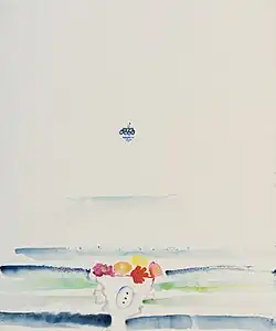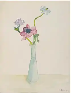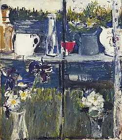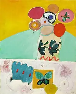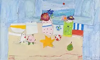 In 1947 a critic said Schloss's non-representational paintings were dominated by their "abstract pattern" and, two years later, another called her paintings "light-hearted abstractions".[24][1] In 1949 a critic described one of her paintings as a "lyric abstraction made up of pastel-colored, bird-like curves".[29] The painting called "Games" (see image 2, above), might be this painting or one like it. In the 1950s, one critic said her still lifes were "delicate" and "quaintly arranged".[60] Another said they were "charming and pretty", having "dainty arrangement" and "painted with a free but clearly intentioned stroke."[30] A third called them "tastefully decorative, sincere and pleasantly reminiscent of Chardin, ... but using a modern palette".[33] Schloss's untitled still life known as "The Vase" (see image 3, above) was made at this time. In the same period, critics said her landscapes were "realist",[30][31] captured "the chill and intense light" of the locale they depicted (in this case scenes of coastal Maine),[33] and achieved a "brilliant coldness of blue tonality" (again of Maine).[31] The untitled painting known as "West Window" or "Red Cup" (see image 4, above, painted at Deer Isle, Maine) comes from this period.