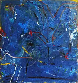 In 1966 she contributed watercolors to an event called a "sonic portrait of the city of Rome". This was the first of a number of collaborations with the avant-garde composer Alvin Curran who later became her partner and lifelong friend.[18][12] She was given her last solo exhibition at the Ingber Gallery in 1989.[45] She continued to be given solo exhibitions in Rome during the first decade of the 21st century.[7] A 1997 show at the high school in Rome from which her son had graduated was probably the first solo exhibition following her death.[20] In 2015 the Sundaram Tagore Gallery in New York staged what was said to be the most comprehensive display of her work to date.[18] Three years later Meredith Ward Fine Art mounted a retrospective focusing on her work of the 1960s and 1970s. Reviewing this show, Roberta Smith wrote in the New York Times, "At this point in her life, Schloss painted with consummate ease and abundant charm, sketching her subjects and applying color as needed."[46] In 2022 Alexanre Gallery mounted a show that included works by artists who were her friends along with her own works.[41] In 2023 one writer showed that the response to Schloss's work was not uniformly positive, writing, "Schloss was a good but not great painter. Today her work is of interest primarily for how she melded the influences of the two artists she most admired, Porter and Willem de Kooning."[47]
