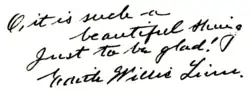 Edith Willis Linn Forbes (née, Willis; after first marriage, Linn; after second marriage, Forbes; pen name, E. W. L.; February 19, 1865 – September 29, 1945) was an American poet and writer. Active in clubs,[1] she founded the Rochester Poetry Society, and served as president. Forbes contributed to The Christian Register, the Cottage Hearth, the Christian Union, the Boston Transcript, Godey's Lady's Book, Peterson's Magazine, the Kew Moon, the Century, and other prominent periodicals. Forbes published a volume of Poems in 1891. Her poem "Restless Heart Don't Worry So," was translated into French, Russian and German, widely circulated in England and the U.S. and set to music by three different composers.[2]
