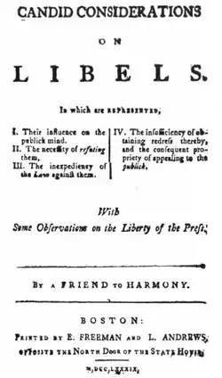 From: Candid Considerations on Libels by "a friend to harmony" (Boston: printed by E. Freeman and L. Andrews, 1789)