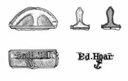 In 2014 a Parks Canada research vessel located the intact and well preserved wreck of the Erebus in shallow water near O'Reilly Island, south of King William Island.[5] After two seasons of archaeological dives to study of the upper deck of the vessel they broke through to the lower deck below and the first cabin they chanced upon was the pantry of the Captain's Steward. Subsequent dives have recovered numerous artefacts from the pantry, some being items relating to his role on the ship such as a full dinner set of 48 blue and white Whampoa china used by the officers. Many of the finds are personal items such as a pewter stamp inscribed "Ed.Hoar" and a bundle of coins with holes through the middle, originally tied together, consisting of a 1797 George III cartwheel penny and several Chinese coins current in Nanking at the time. A hair brush with human hair was found in his cabin but the hair was too degraded to extract DNA to match to Hoar (or indeed Franklin). Also found in the cabin but not necessarily related to Hoar were a Latin primer, pens and pencils, sealing wax (with a finger print in it), an accordion, a sealed medicine bottle marked "C" and Arabica coffee beans.[6] In 2022 a large intact book cover/portfolio with a quill pen tucked inside was also recovered.[7] It has been undergoing conservation since 2022.[7]