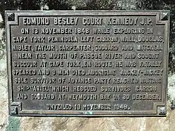 The Kennedy Memorial Monument was unveiled on 13 December 1948 in Somerset, Queensland in commemoration of the 100th anniversary of Kennedy's unsuccessful exploration of Cape York Peninsula.[14] The monument comprises a concrete slab on a concrete footing with a bronze commemorative plaque on its eastern face.[15][16]