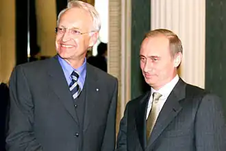 Stoiber is known for backing Vladimir Putin and there have been comparisons to Gerhard Schröder. One author called Stoiber a "Moscow's Trojan Horse".[20][21][22] Putin is known to have given Stoiber "extreme forms of flattery" and privileges such as a private dinner at Putin's residence outside Moscow.[23]