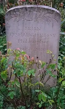 O'Shaughnessy died on 25 January 2022, at the age of 97 and was buried with her husband, the philosopher Brian O'Shaughnessy on the eastern side of Highgate Cemetery, as the western side had been accidentally lit on fire.[5]