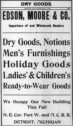 The firm began in 1872, when several former employees and partners of Allan Sheldon & Company (formerly Town & Sheldon) elected to form their own firm under the name Edson, Moore & Co. Those men were James L. Edson, George F. Moore, Ransom Gillis, Charles Buncher and Stephen Baldwin. Both Edson and Moore had been partners in the Allan Sheldon & Company firm. The new firm, Edson Moore, originally occupied the addresses of 190-192 Jefferson Avenue in Detroit.[3][4] They quickly established themselves as one of the largest dry goods and wholesale businesses in Michigan[5] occupying a larger store front on Jefferson Avenue from 194 through 204 in a building built expressly for their needs.