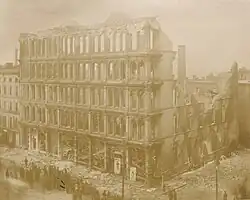 During the lunch period on November 25, 1893, the building on Jefferson Avenue caught fire and was consumed by the flames. The fire started on the fifth floor near the elevators, where cotton batting and light goods were stored, and quickly spread to the remainder of the five-story building. It was suspected that one of the employees, against company policy, was smoking and the cotton ignited. Five employees were killed due to the fire and smoke and an additional two, jumped 75 feet out of fifth story windows, to their deaths. George Moore's son, Charles W. Moore was in the building on the third floor during the fire and managed to escape.[15] Inventory that had been recovered from the fire was sold at auction in Chicago, Illinois in February 1894.[16][17]
