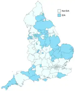 In England, Education Investment Areas (EIAs) are educationally underperforming areas prioritised for extra funding[1] and support by the British government, with the intention of improving standards.[2][3] They were introduced in 2022 as part of the levelling-up policy of the British government. There are currently 55 Education Investment Areas;[4] 24 of these have been designated as Priority Education Investment Areas, sharing an additional fund of £40 million.[5]