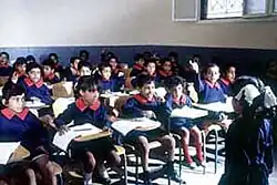 Primary education is compulsory for all children in Saudi-Arabia.[31] Primary education lasts 6 years, from the age of 6 until 12.[29] The curriculum consists of Arabic, Islamic education, mathematics, science and art. In 2021 the ministry of education introduced a new rule that required schools to start teaching English from first grade onwards as well.[32] The goal of this requirement is to improve the education outcomes. In 2018, 9% of the students were enrolled in a private school.[31]