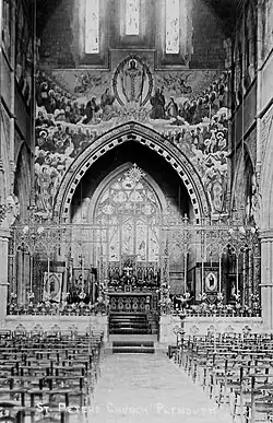 Prynne's most ambitious scheme, and perhaps his masterpiece, was a mural painted on the walls of St. Peter's Church, Plymouth – a church designed by George Fellowes Prynne – in memory of their Father. Painted above the chancel arch, it depicted Christ triumphant, surrounded by hundreds of angels and saints.[18] Such was the size of the painting, approximately 650 square feet, that it was executed in separate sections, pieced together. On the side walls immediately above the nave arcade were scenes from the life of St Peter, and other pictures adorn the walls of the church.