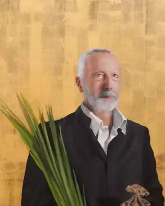 | Attributes | Martyr's palm, small bag of money |