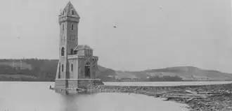 In Cooperstown, New York, where his father-in-law practiced law and had served as the District Attorney, Clark bought significant amounts of land had built the Hotel Fenimore, Pioneer Mills, and several cottages and farm houses.[4] In 1856, Clark bought the "Apple Hill" estate near Cooperstown, on the shore of Otsego Lake. On the property, he built a large stone country house known as "Fernleigh" in 1869.[14] In 1874, he acquired an additional 500 acres where he built a Swiss chalet and, in 1876, he again hired Hardenbergh to build him a Gothic Revival castle that rose out of Otsego Lake and became known as Kingfisher Tower.[4]