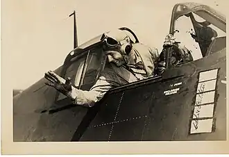 "Eddie" Outlaw in an F6F Hellcat fighter plane displaying five kills