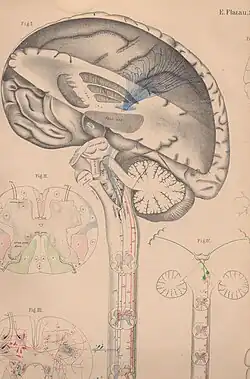 His law played an important role in the initial studies of the spinal cord. With the Berlin neurobiologist Johannes Gad, Flatau performed experiments on dogs and criticized the Bastian-Bruns law concerning the loss of function following spinal cord injury (1893). On the basis of numerous clinical spinal cord surgeries, experiments, and subsequent observations, he discovered that the "greater the length of the fibres in the spinal cord the closer they are situated to the periphery" (Flatau's law). He provided evidence for the laminar arrangement of spinal pathways. [27] He also described the fifth, seventh, and eighth cranial nerves, and carefully outlined their nuclei. The paper on this topic, Das Gesetz der excentrischen Lagerung der langen Bahnen im Rückenmark, was published in 1897. For this work he received a PhD in medical sciences in Moscow in 1899 (dissertation Zakon ekstsentricheskago raspolozheniia dlinnykh putei v spinnom mozgu). [28] This work was presented in 1949, next to a portrait of the author, on display at the IV International Congress of Neurologists in Paris.[14]