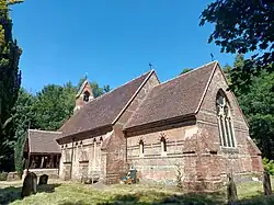 Holy Trinity, the Church of England parish church at Ebernoe, West Sussex, was built at a cost of £1200 of polychrome local brick with an open belfry and steep boarded roof between 1865 and 1867.[7] W.R. Peachey, lord of the manor, laid the foundations stone at the east end. There are no aisles. There are lancet windows in the nave and chancel, the lancets at the west end being trefoiled. The east and west windows have tracery, and there are foliage corbels on the chancel arch. It had a plain interior which was later whitened.[28]