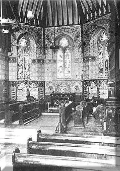 The foundation stone of St Andrew's Church, Queens Road, Hastings, was laid in November 1869.[4] It was constructed by John Howell,[7] whose fee was £3,235.[4] It held a congregation of 2,000, and was consecrated on 30 November 1870 by Richard Durnford (1802–1895), Bishop of Chichester.[31] It was decorated with a mural by Robert Tressell in 1905.[5][32] The building survived until 1970 when it was declared unsafe and demolished between August and September of that year. One panel of Tressell's mural was saved, and is now in Hastings Museum.[31][33] The mural is the Islamic-style decorative work covering the walls around the windows at the east end (see image, right).
