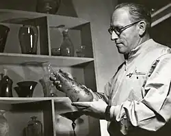 ![]() Hald viewing the first "Graal glass" vase from the collection at Orrefors Glassworks ca 1938-1940. | |