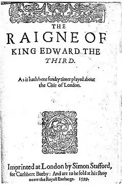The Raigne of King Edward the Third, often shortened to Edward III, is an Elizabethan play printed anonymously in 1596, and possibly at least partly written by William Shakespeare. It began to be included in publications of the complete works of Shakespeare only in the late 1990s.[1] Scholars who have supported this attribution include Jonathan Bate, Edward Capell, Eliot Slater,[2] Eric Sams,[3] Giorgio Melchiori[4] and Brian Vickers.[4] The play's co-author remains the subject of debate: suggestions have included Thomas Kyd, Christopher Marlowe, Michael Drayton, Thomas Nashe and George Peele.