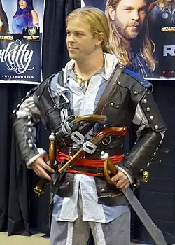 A cosplayer recreating Edward Kenway's unhooded appearance.