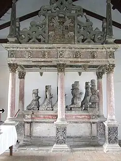 The dates of death for Dame Susan (who died first) and Sir Edward vary slightly between the tomb inscription (2 and 3 October), the printed epitaph and the funeral certificate (3 and 4 October). They were buried in St Mary's church, Denham on 5 October 1605, and Sir Edward was succeeded as heir by his elder son Edward Lewknor.[54]
