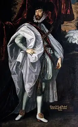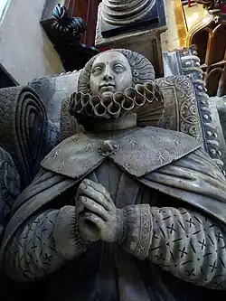 At Bottesford Church in Leicestershire there is the tomb commemorating the third Earl and his wife. It was created by Gerard Johnson the elder of Southwark, a Flemish craftsman. Earl Edward lies on a mat, wearing full plate armour. Instead of a gorget protecting his throat he wears a ruff. He wears the Order of the Garter on his left leg. His coronet has disappeared and at his feet is a decorated bull crest. Countess Isabel, daughter of Sir Thomas Holcroft, KT, wears a ruff with the usual dress of the time under an ermine-trimmed mantle, her head supported by a cushion. Her only daughter, Elizabeth, kneels at her feet. The inscription on the tomb lists the Earl's activities in the Scottish "troubles" of the time.[3]