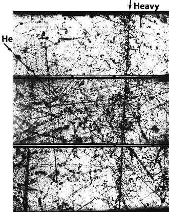 In ordinary matter, atoms of these elements consist of a nucleus surrounded by a cloud of electrons, but when the nuclei arrive as cosmic rays, they are devoid of electrons, because of collisions with atoms in interstellar matter. In both emulsions and cloud chambers, these "stripped" heavy nuclei leave an unmistakable track, which is much denser and "hairier" than that of protons, and whose characteristics make it possible to determine their atomic number. In further flights, the group showed that the abundances of elements in cosmic rays are similar to those found on Earth and in stars.[14] These results had a major impact, for they showed that studies of cosmic radiation could play a significant role in astrophysics.