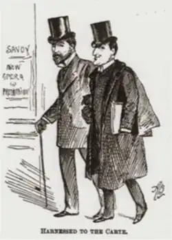 With F. C. Burnand, Solomon wrote Pickwick (1889), which also had a run in 1894,[10] Domestic Economy (1890), and "The Tiger" (1890). Burnand's contribution to the last of these was so unacceptable that the work was hissed off the stage on its opening night.[11] Pickwick was recorded by Retrospect Opera in 2016, together with George Grossmith's Cups and Saucers.[12]