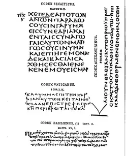 - ^ a b Tischendorf, Constantin von (1881). Leigh, Dr Edwin (ed.). The Sinai and comparative New Testament: The authorized English version; with introduction, and various readings from the three most celebrated manuscripts of the original Greek text. The New Testament as the early christians had it in the fourth century;vol. 1; Gospels. New York: Ivison, Blakeman, Taylor, and company.