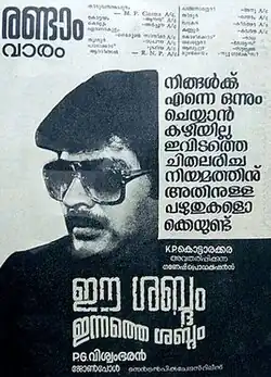 Ee Sabdam Innathe Sabdam is a 1985 Indian Malayalam-language action thriller rape and revenge film, directed by P. G. Viswambaran, written jointly by Sharada and John Paul and produced by K. P. Kottarakara. The film stars Mammootty in the lead role, while Shobana, Rohini, Captain Raju and Vijayraghavan play supporting roles. It is loosely based on the Hollywood movie Death Wish 1974.[1][2][3] The film was a blockbuster[4] and was one of the biggest hits of the year.[5]