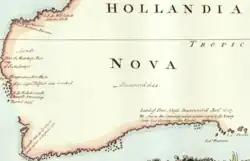 By the mid to late 1620s the Dutch had gathered a good deal of information, enabling them to chart with some accuracy the west coast of what had become known by then as Eendrachtsland. Heeres then goes on to say that the coastline showed breaks in various places, due to unexplored openings such as Exmouth Gulf.[2] These gaps are clearly visible on the full-sized 1627 chart image:[2]