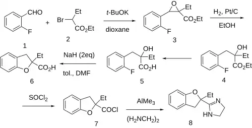 The Darzens reaction between 2-fluorobenzaldehyde [57848-46-1] (1) and Ethyl 2-bromobutyrate [533-68-6] (2) gives ethyl 2-ethyl-3-(2-fluorophenyl)oxirane-2-carboxylate, CID:100942311 (3). A catalytic hydrogenation over Pd/C would give ethyl 2-[(2-fluorophenyl)methyl]-2-hydroxybutanoate, CID:77591056 (4). Saponification of the ester then gives 2-[(2-Fluorophenyl)methyl]-2-hydroxybutanoic acid, CID:53869347 (5). Treatment with 2 molar equivalents of sodium hydride apparently gives 2-Ethyl-2,3-dihydrobenzofuran-2-carboxylic acid [111080-50-3] (6). Treatment of the carboxylic acid with thionyl chloride then gives the acid chloride and subsequent treatment of this with ethylenediamine in the presence of trimethylaluminium completed the synthesis of Efaroxan (8).