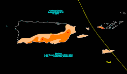 Because the hurricane moved farther northeast than initially anticipated, its effects in Puerto Rico were relatively limited.[13] Rainbands associated with the hurricane produced gusty winds and heavy rain on August 28–29.[46] The heaviest rains were concentrated on the southern and eastern coasts of the island, peaking at 5.44 in (138 mm) in Juana Díaz.[34] Wind gusts in Culebra reached 62 and 35 mph (100 and 56 km/h) in San Juan.[13][46] Approximately 23,000 households lost power across the territory.[13] A man in Bayamón died when he fell off his roof trying to clean drains in advance of the storm.[47] Flash floods, rockslides, and mudslides impacted multiple counties with a few disrupting travel.[48] One person was trapped by floodwaters near Humacao.[49] Elsewhere, The Blanco, Guayanés, and Marín rivers topped their banks, submerging local roadways.[48]