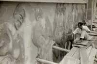Painting the Mural Embarque in 1964. The mural represents the banana industry from the workers (left) to the shipping (right).