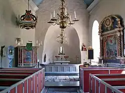 The church contains a medieval altar and a baptismal font dating from the 12th century in the style of Hegvald. The altarpiece and pulpit are from the mid-18th century and made by master carpenter Nils Lindman.[1][3]