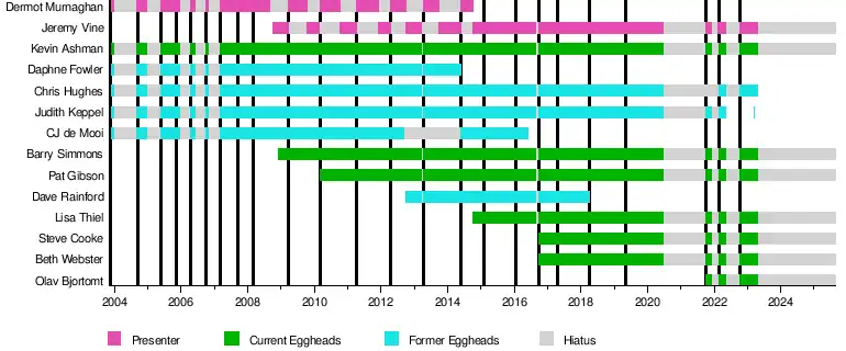 In the first eight series, the team consisted of only five Eggheads who each appeared in every episode and did not rotate. At the end of 2008, a sixth Egghead was added and appearances rotated. From series 15, five of eight possible Eggheads appear each episode, and later in 2016, two brand-new Eggheads (one male and one female) joined the panel after a spin-off series entitled Make Me an Egghead. Currently, there are 7 Eggheads (5 male and 2 female): Kevin Ashman, Barry Simmons, Pat Gibson, Steve Cooke, Olav Bjortomt, Lisa Thiel and Beth Webster and they currently appear on Channel 5.