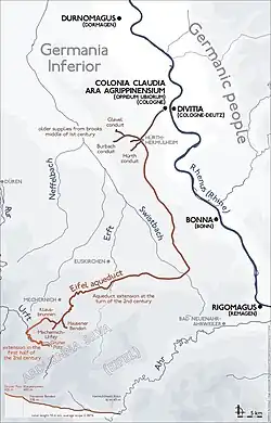 The aqueduct began at a spring in the area of Nettersheim in the Urft river valley. It then travelled along the valley to Kall, where it had to overcome the divide between the Maas and the Rhine. The Roman engineers chose this spot because they were able to overcome the divide without resorting to a tunnel or a pump. The aqueduct then ran parallel to the northern Eifel Mountains, crossing the Erft near Kreuzweingarten (in the Euskirchen district) and the Swistbach with an arched bridge. In Kottenforst, northwest of Bonn, it passed through the Vorgebirge highlands. Finally, it ran through Brühl and Hürth before arriving in Cologne. Other springs in the region that met Roman quality and quantity guidelines were also equipped with aqueducts to feed the main line.
