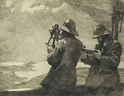 More monumental than the three panels that preceded it, the two figures dominate the foreground of Eight Bells, and the details of the ship are minimally rendered.[2] Homer shows the figure at left using an octant to take a reading of the sun, the other apparently reading the altitude of a completed sight on his octant. The moment is prosaic, yet it is presented as a heroic image.[5] In 1887 Homer produced an etching based on the painting, in which he further minimized the ship's rigging and diminished the area of sky, thereby focusing more on the figures.[5]