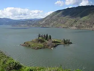 Eighteenmile Island is a 9.89 acre (4 ha) island on the Oregon side of the Columbia River at river mile 174 in Wasco County, Oregon, United States. The official name derives from its location 18 nautical miles west of Big Eddy and the historic narrows now covered by The Dalles Dam.[1] It is about a half mile (0.8 km) downstream of Mosier, Oregon and four miles (6.4 km) upstream of Hood River. It can be seen from Interstate 84, which runs along the Oregon side of the Columbia River, and from the Historic Columbia River Highway. A small rocky "island" downstream of Eighteenmile Island houses a navigational light. The island is mentioned in the journal of Meriwether Lewis, from the Lewis and Clark Expedition.[2]